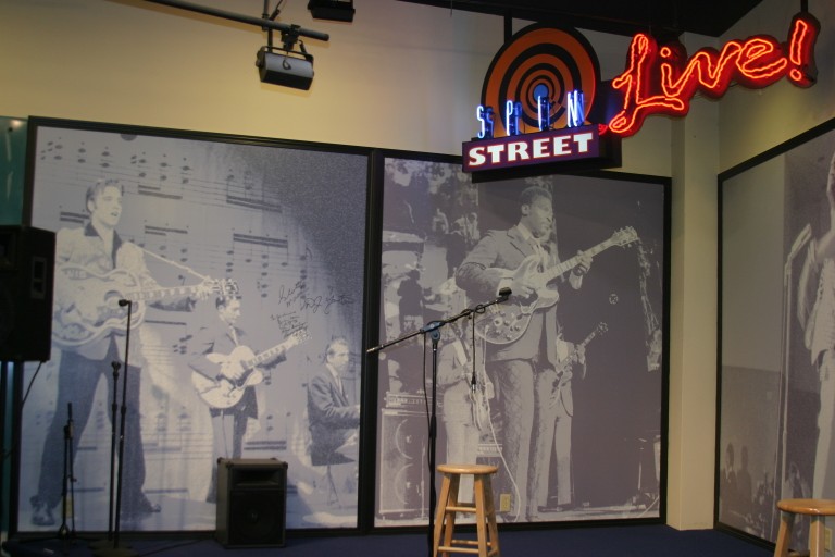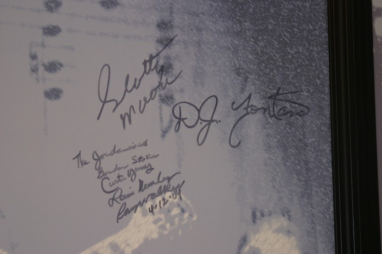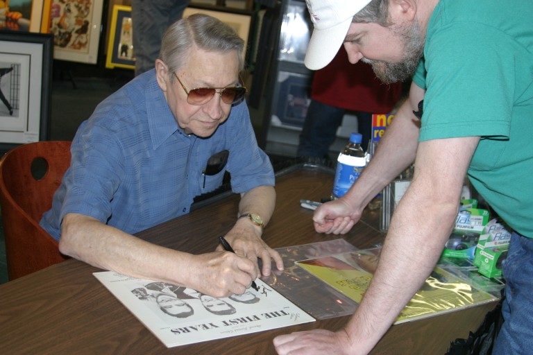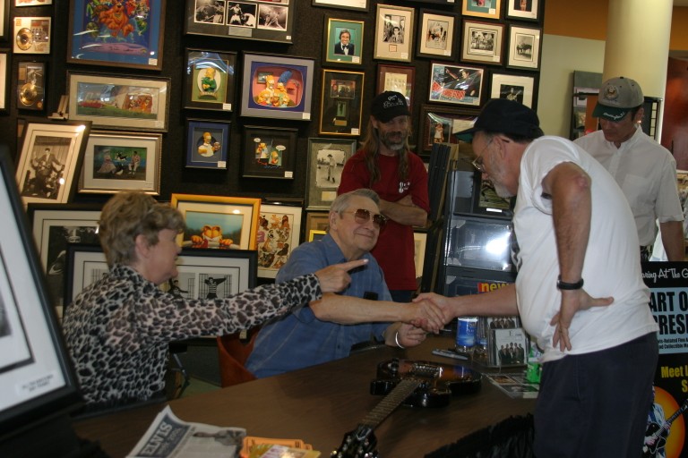 Jordanaires sign a large artwork that is part of the backdrop of a stage